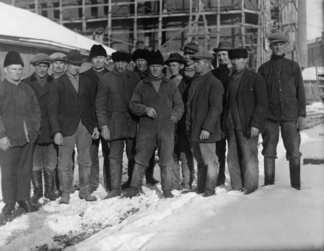 ![]() Kirvesmiehiä vuonna 1925 OTK:n työmaalla Hämeentiellä |