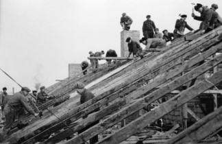 ![]() Kirvesmiehiä talkootöissä Kotkankadun uudella Lehtitalolla vuonna 1951 |